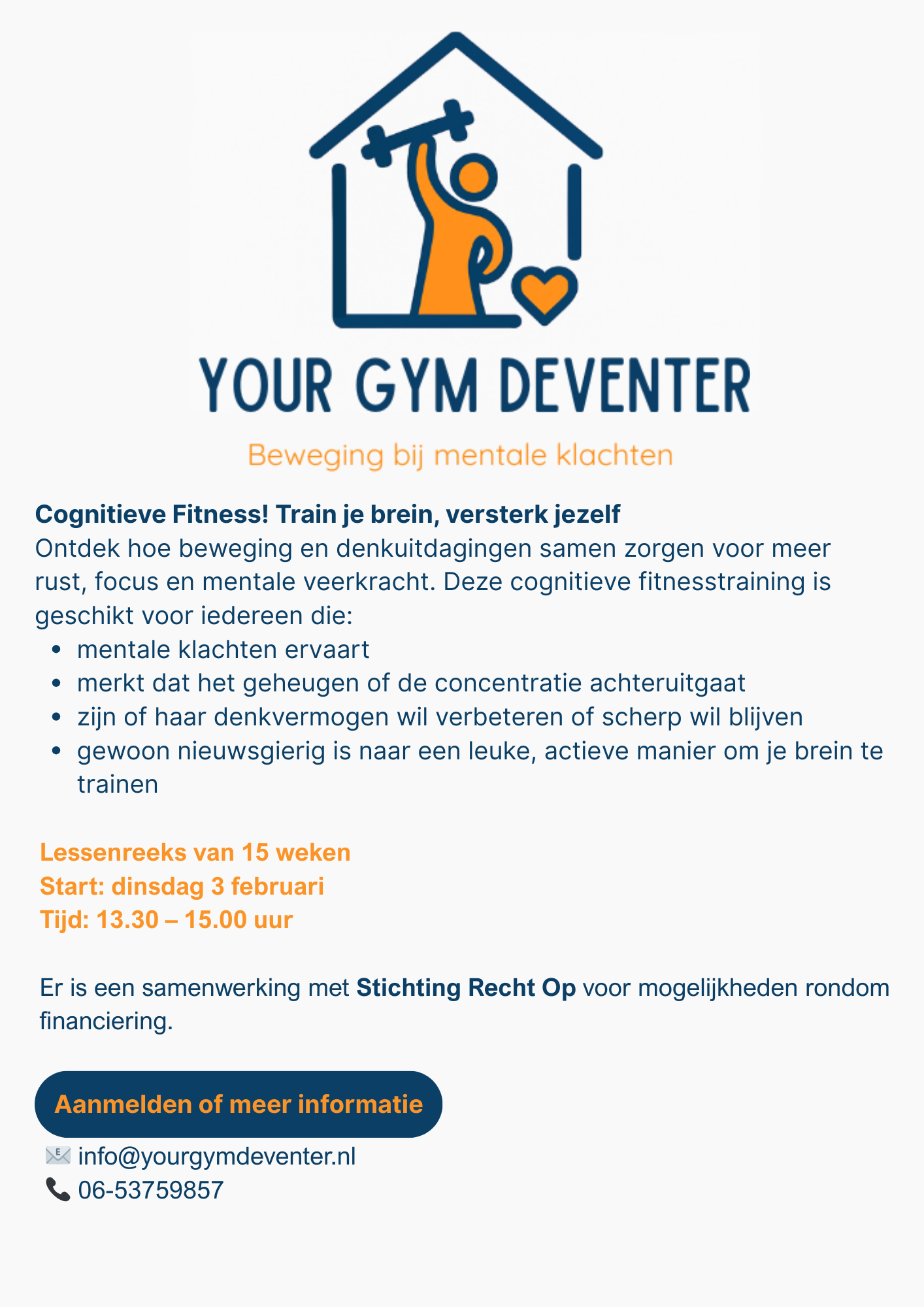 Ontdek hoe beweging en denkuitdagingen samen zorgen voor meer rust, focus en mentale veerkracht. Deze cognitieve fitnesstraining is geschikt voor iedereen die: